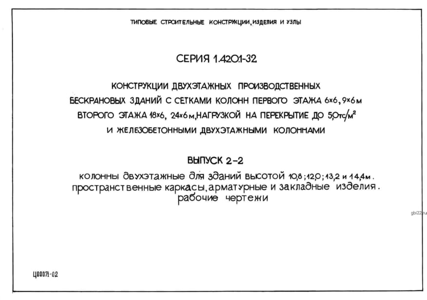 | Название стандарта | Конструкции двухэтажных производственных бескрановых зданий с сетками колонн первого этажа 6х6, 9х6 м второго этажа 18х6, 24х6 м, нагрузкой на перекрытие до 5,0 тс/м2 и железобетонными колоннами. |