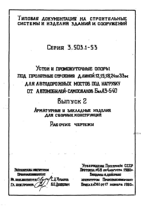 | Название стандарта | Устои и промежуточные опоры под пролетные строения длиной 12, 15, 18, 24 и 33 м для автодорожных мостов под нагрузку от автомобилей-самосвалов БелАЗ-540. |
