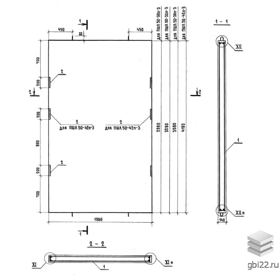 Панели шахт лифтов ПШЛ 50-42п-3 размеры: длина, мм.: 1960, ширина, мм.: 140, высота, мм.: 4180, вес, кг.: 2870, марка бетона: М200. Изделия относятся к категории Шахты лифтов железобетонные-Панели шахт лифтов и изготавливаются по технической документации согласно серия 1.089.1-2