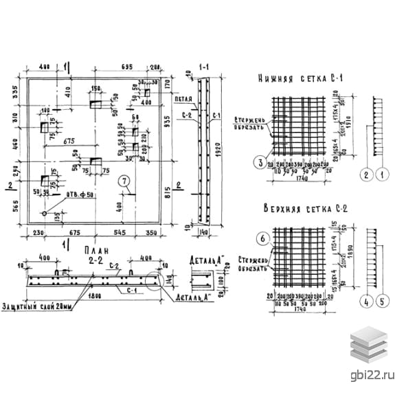 Для обеспечения прочности изделия используется арматурный каркас, который закладывается в тело плиты в виде сварных сеток. В конструкции предусмотрены металлические закладные для сопряжения с другими элементами.