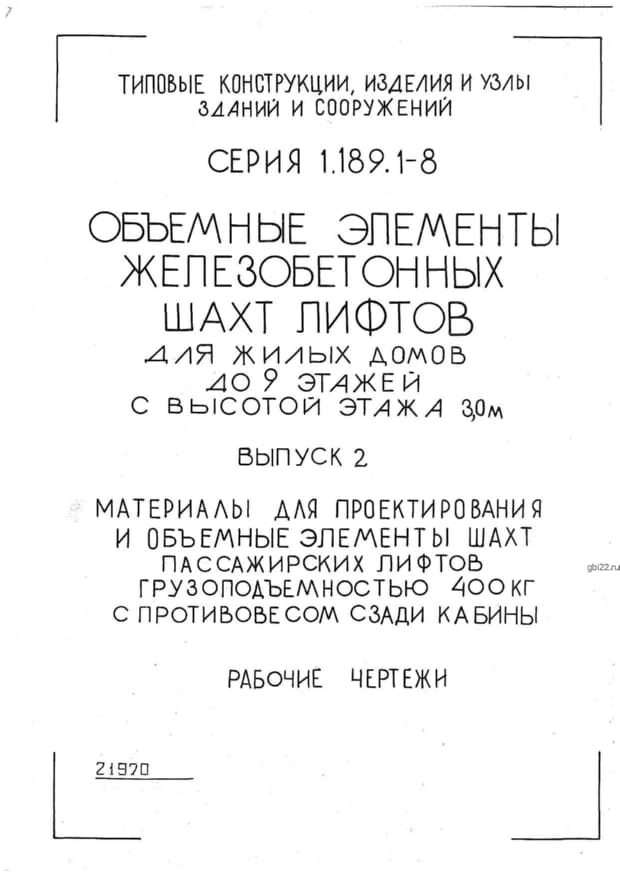 | Название стандарта | Объемные элементы железобетонных шахт лифтов для жилых домов до 9 этажей с высотой этажа 3 м. |