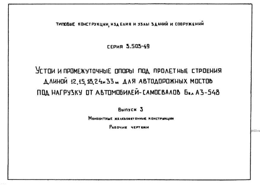 | Название стандарта | Устои и промежуточные опоры под пролетные строения длиной 12, 15, 18, 24 и 33 м для автодорожных мостов под нагрузку от автомобилей-самосвалов БелАЗ-548. |