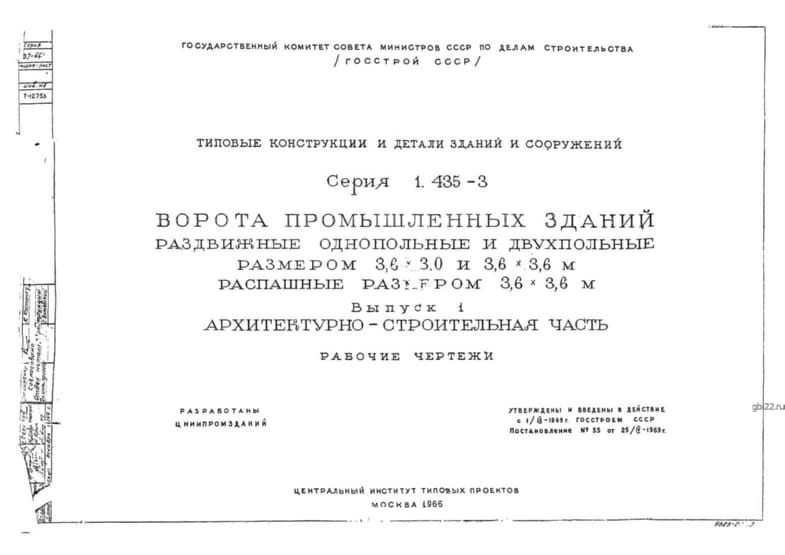 | Название стандарта | Ворота промышленных зданий раздвижные однопольные и двухпольные размером 3,6х3,0 и 3,6х3,6 м, распашные размером 3,6х3,6 м. |