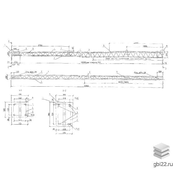 Изделие армировано пространственными каркасами из стальных стержней классов Ат-IV, Ат-V, Ат-VI. В теле конструкции предусмотрены: