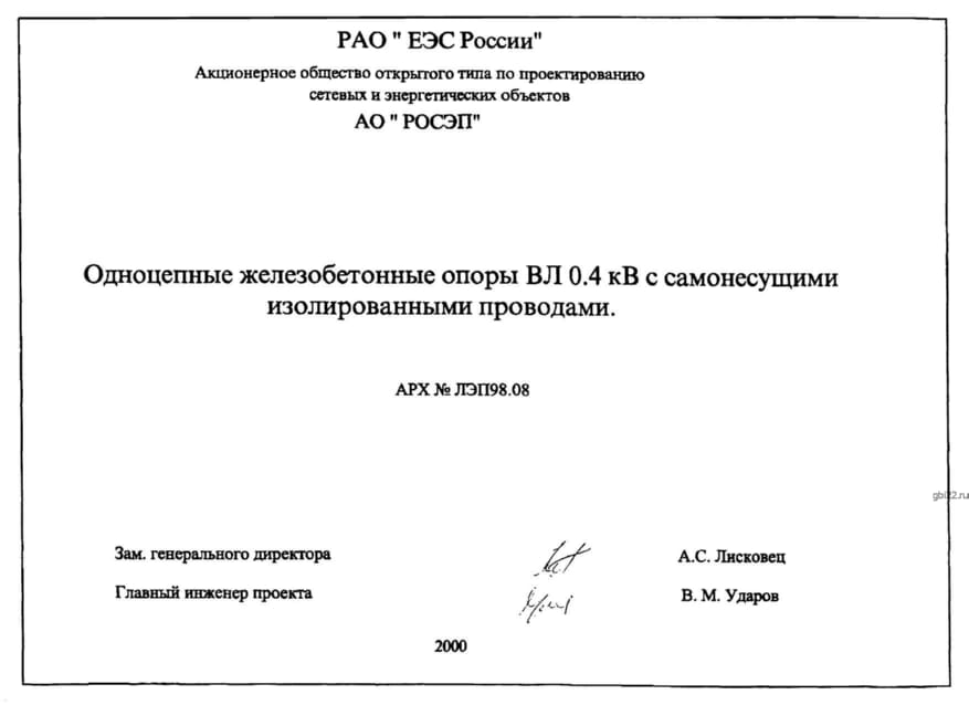 | Название стандарта | Одноцепные железобетонные опоры ВЛ 0,4 кВ с самонесущими изолированными проводами. |