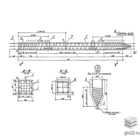 Свая представляет собой вертикальную бетонную конструкцию с усиленным армированием. Имеет заострённый конец для удобного погружения в грунт и арматурные выпуски для соединения с другими элементами.