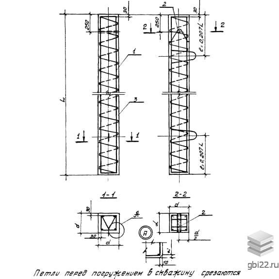 Сваи армируются пространственными каркасами и сетками, которые обеспечивают прочность конструкции. Рабочая продольная арматура изготавливается из стали классов A1, AII, AIII, поперечная – из проволоки периодического профиля класса ВрI. Для подъема изделия предусмотрено отверстие на расстоянии 0,25 м от торца, выполненное из металлической трубки. Производитель обязан разработать меры по антикоррозийной защите свай от агрессивных грунтовых вод в соответствии с СНиП II-2.