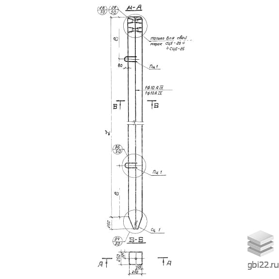 Свая квадратного сечения СЦ 5-25 (1.011-6) представляет собой прочное железобетонное изделие прямоугольной формы с острием на конце. В теле элемента предусмотрены штырь и подъемные петли. Эти конструкции применяются при возведении общественных зданий, производственных объектов и сельскохозяйственных сооружений. Их использование разрешено практически во всех грунтовых условиях, за исключением скальных и вечномерзлых грунтов. Сейсмичность районов, где можно применять сваи данного типа, не должна превышать шести баллов.