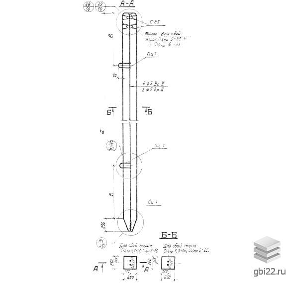 Высокую прочность изделиям придает армирование продольной арматуры, которая расположена в центре сечения железобетонных свай. В качестве арматуры используется сталь класса A-IV, проволока класса Bp-II по ГОСТ 8480-63, а также семипроволочные пряди класса П-7. Сетка и спираль в верхней части элемента выполнены из проволоки класса B-I по ГОСТ 6727-53.