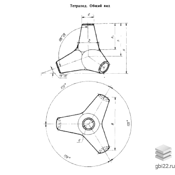 Тетрапод Т 3 (ВСП 33-03-07) – это монолитная железобетонная конструкция с четырьмя конусообразными выступами, соединенными в центральном узле. Такая форма обеспечивает устойчивость и надежное сцепление элементов при монтаже.