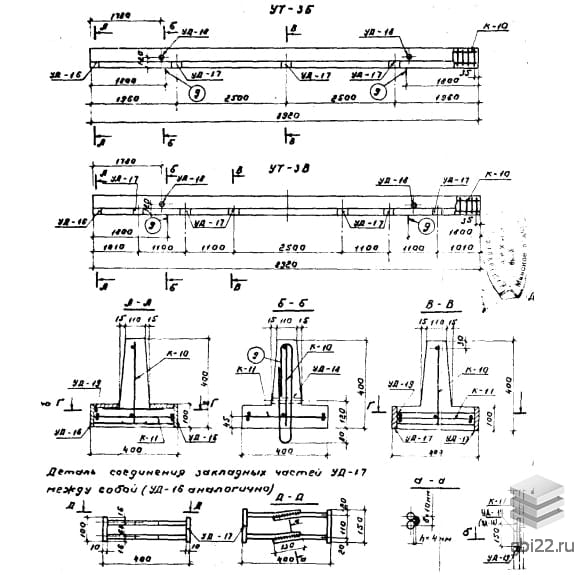 Траверсы УТ 3 б размеры: длина, мм.: 8920, ширина, мм.: 400, высота, мм.: 400, вес, кг.: 1700, марка бетона: М300. Изделия относятся к категории Траверсы железобетонные-Траверсы и изготавливаются по технической документации согласно серия 3.407-40/70