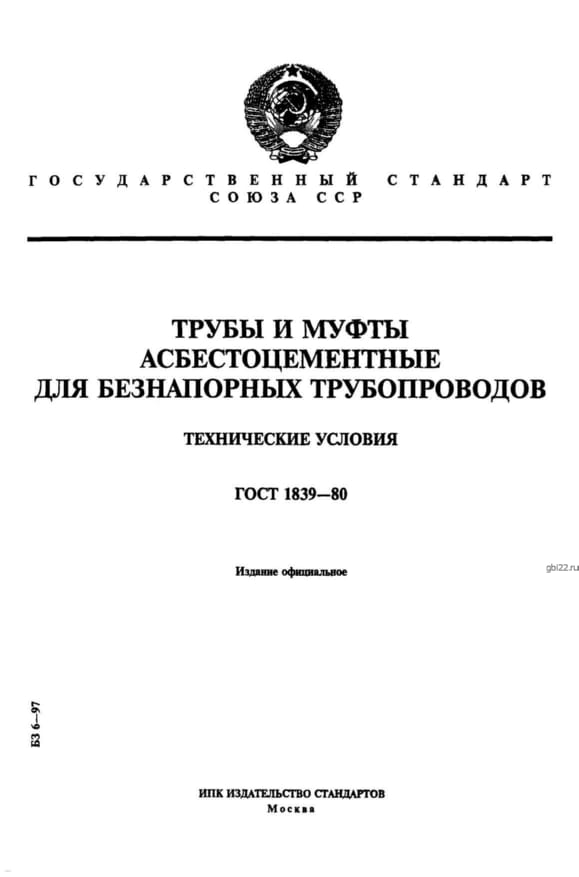 | Название стандарта | Трубы и муфты асбестоцементные для безнапорных трубопроводов. Технические условия. |