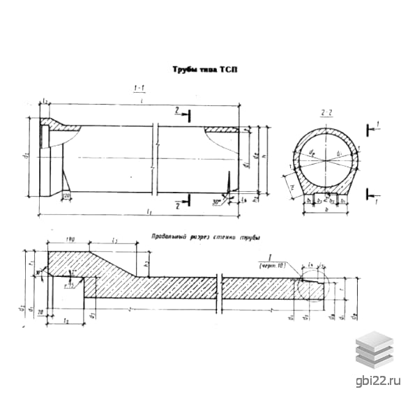 ТСП – труба цилиндрическая раструбная со ступенчатой поверхностью втулочного конца и стыковым соединением, уплотняемым резиновым кольцом, а также обладающая плоской или аналогичной поверхностью снизу;