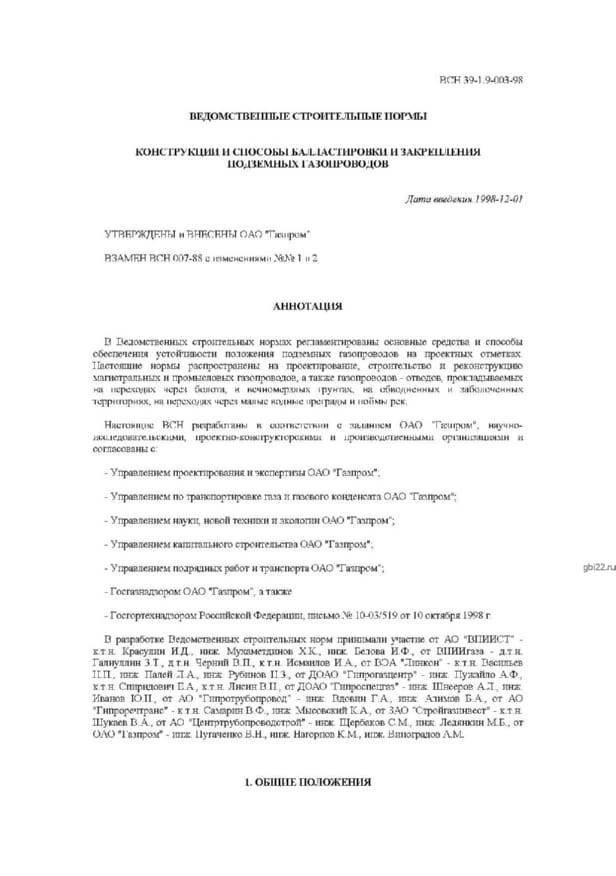 | Название стандарта | Конструкции и способы балластировки и закрепления подземных газопроводов. |