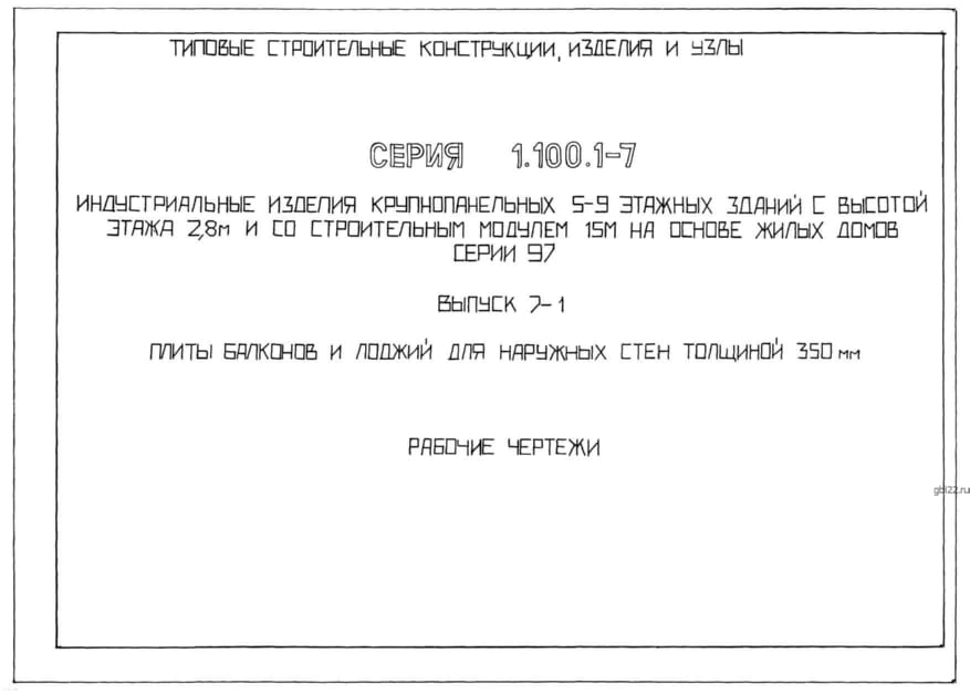 | Название стандарта | Индустриальные изделия крупнопанельных 5 – 9 этажных зданий с высотой этажа 2,8 м и со строительным модулем 15 м на основе жилых домов серии 97. Выпуск 0. Состав серии. Материалы для проектирования. |
