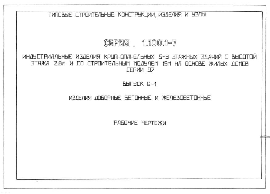 | Название стандарта | Индустриальные изделия крупнопанельных 5 – 9 этажных зданий с высотой этажа 2,8 м и со строительным модулем 15 м на основе жилых домов серии 97. Выпуск 0. Состав серии. Материалы для проектирования. |
