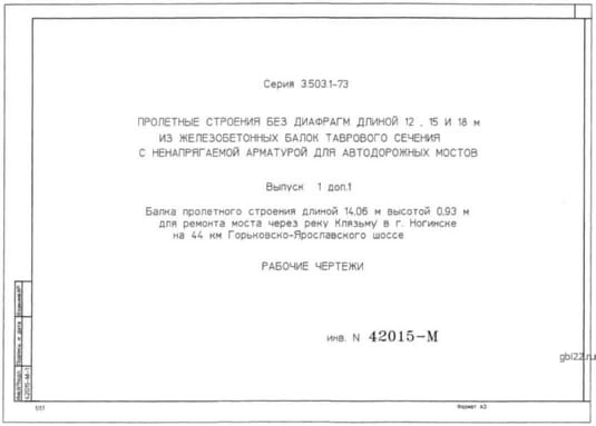 | Название стандарта | Пролетные строения без диафрагм длиной 12 , 15 и 18 м из железобетонных балок таврового сечения с ненапрягаемой арматурой для автодорожных мостов. |