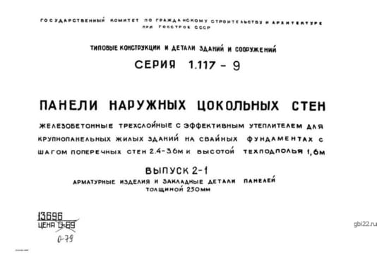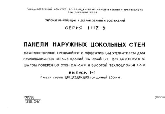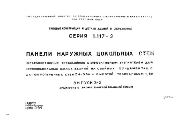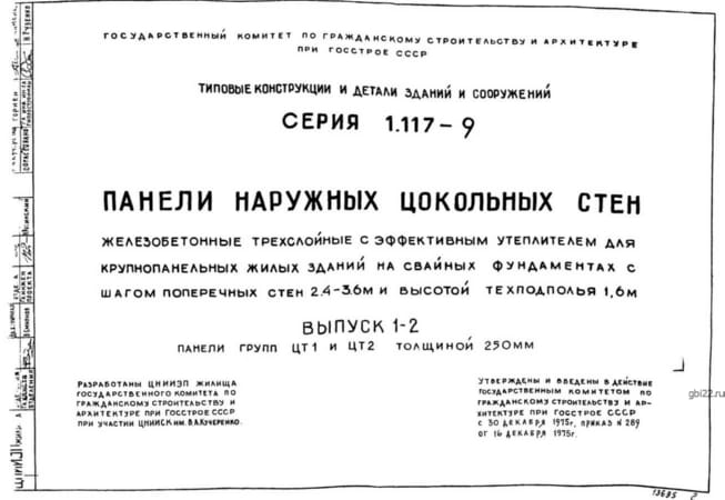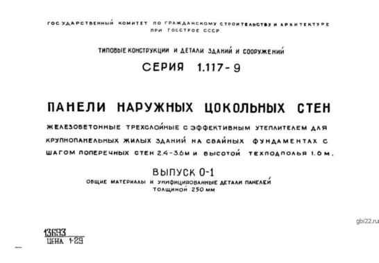 | Название стандарта | Панели наружных цокольных стен железобетонные трехслойные с эффективным утеплителем для крупнопанельных жилых зданий на свайных фундаментах с шагом поперечных стен 2,4 - 3,6 м и высотой техподполья 1,6 м. |