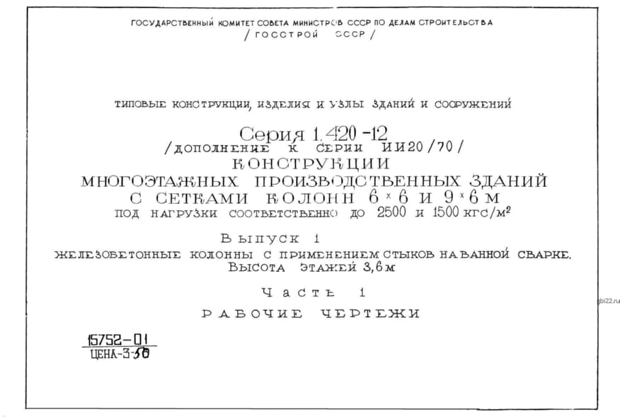 | Название стандарта | Конструкции многоэтажных производственных зданий с сетками колонн 6х6 и 9х6 м под нагрузки соответственно до 2500 и 1500 кгс/кв. м. |